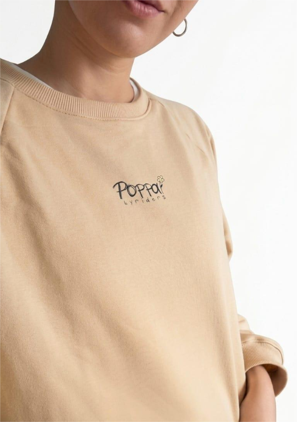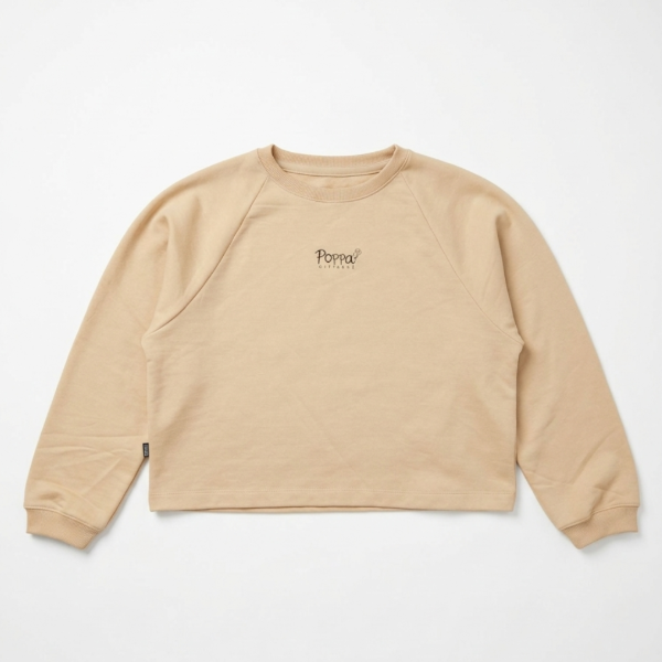 Buzo de dama manga ranglan de rústico de algodón ( sin frisa) con rib en puños y cuello. Con estampa en frente.