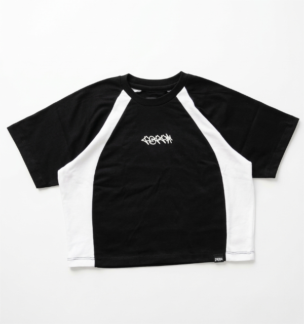 Remera crop de jersey de algodón peinado con recortes en blanco, manga ranglan. Estampa en frente.