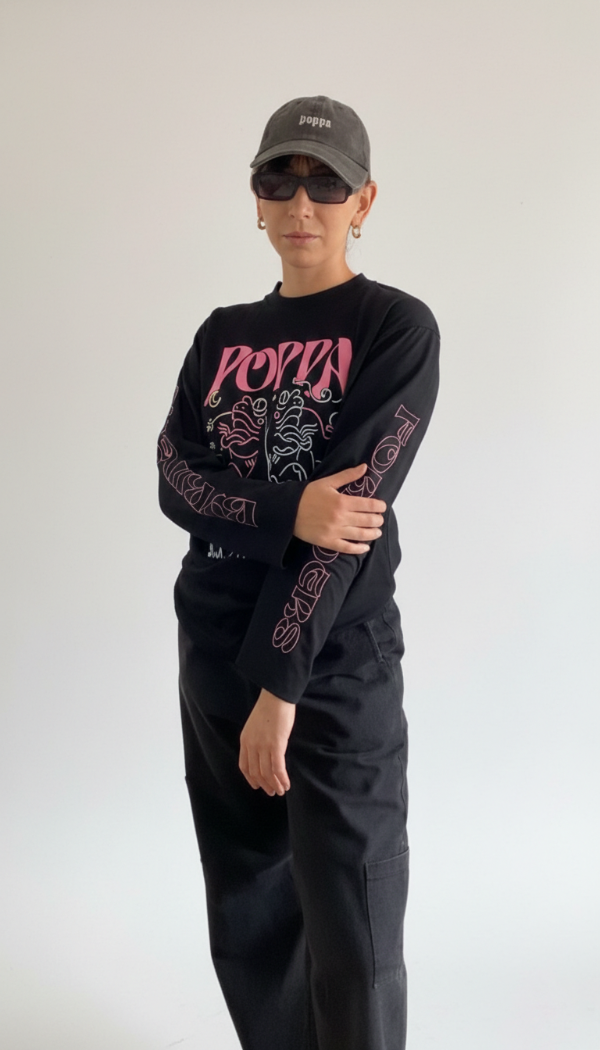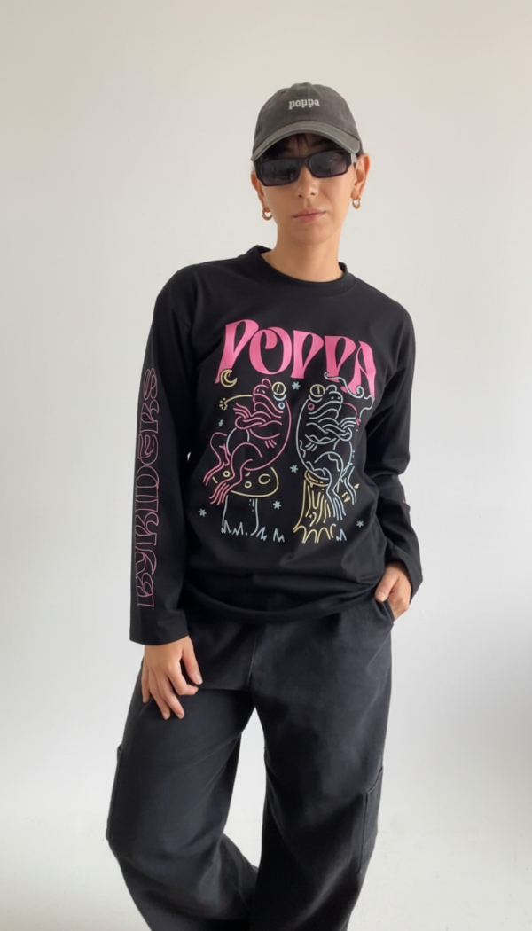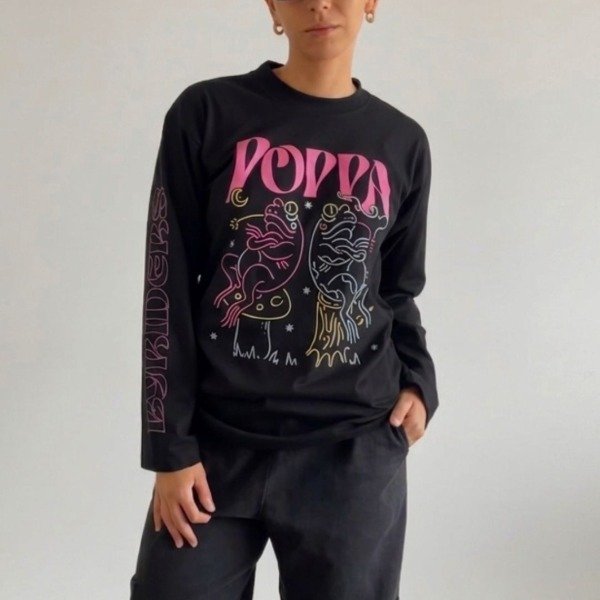 Remera unisex mangas largas de jersey de algodón 24/1 con cuello de rib y estampa en mangas y pecho.