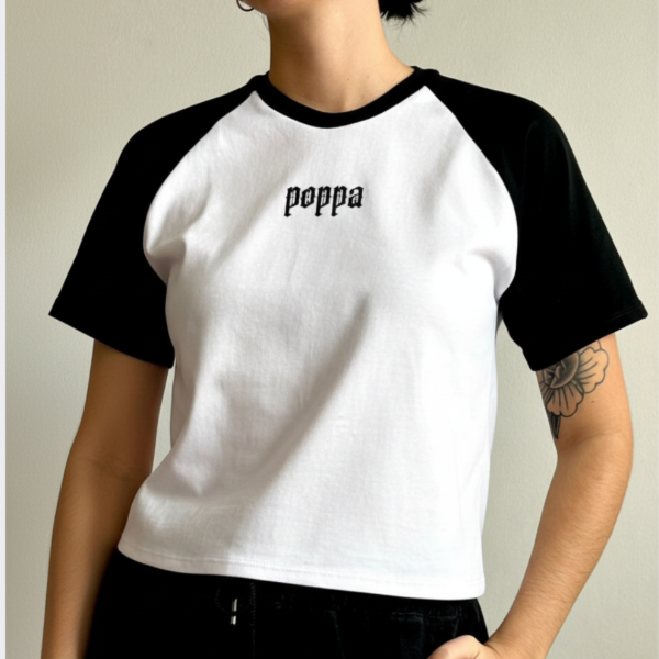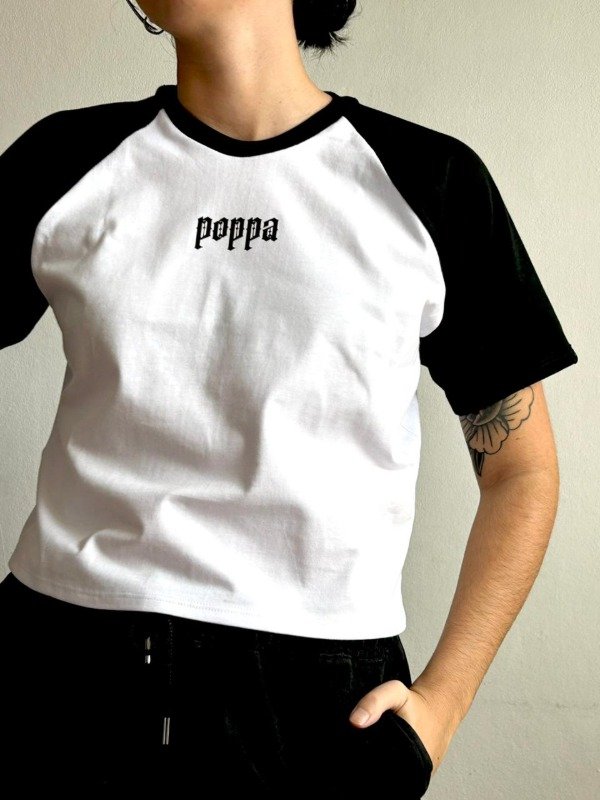 Remera manga ranglan corta de jersey de algodón 20/1 peinado con estampa. Combinación blanco/negro